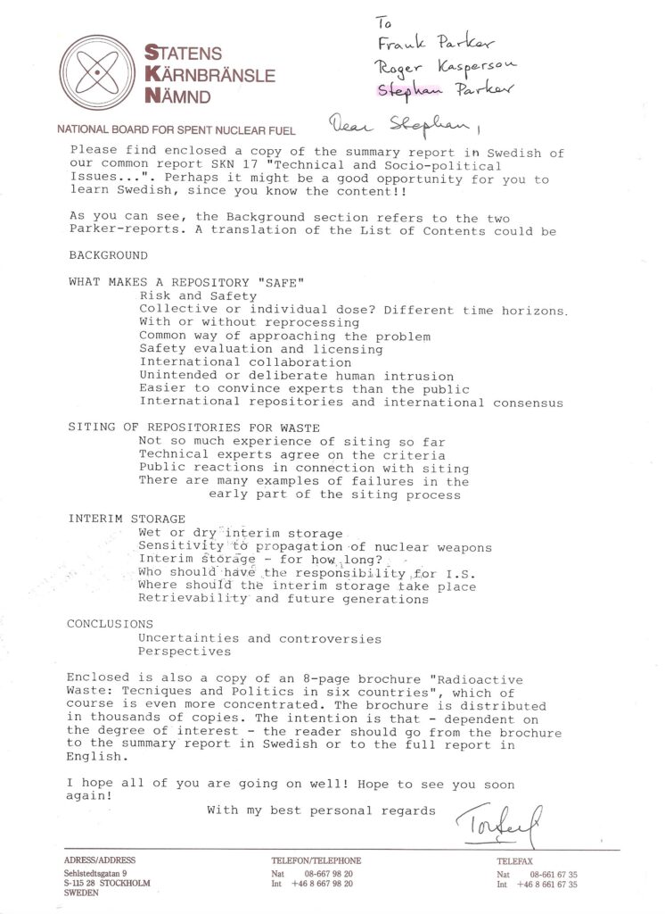 The work was summed up in the section titled Radioactive Waste in Carl Gustaf Bernhard’s 1991 book, The Beijer Institute 1977-1989 [English translation by Roger Tanner].
