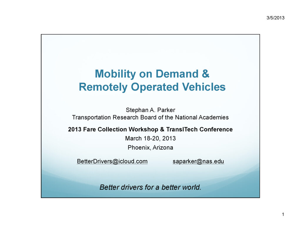 In 2010, Mr. Parker began developing the business case for Better-Drivers–remote piloting of vehicles by qualified operators. Relevant presentations: (1) 2013 National Rural Intelligent Transportation Systems Conference, St. Cloud, Minnesota; (2) 2013 American Public Transportation Association’s TransITech Conference, Phoenix, Arizona; (3) 2012 Intelligent Transportation Systems World Congress, Vienna, Austria.