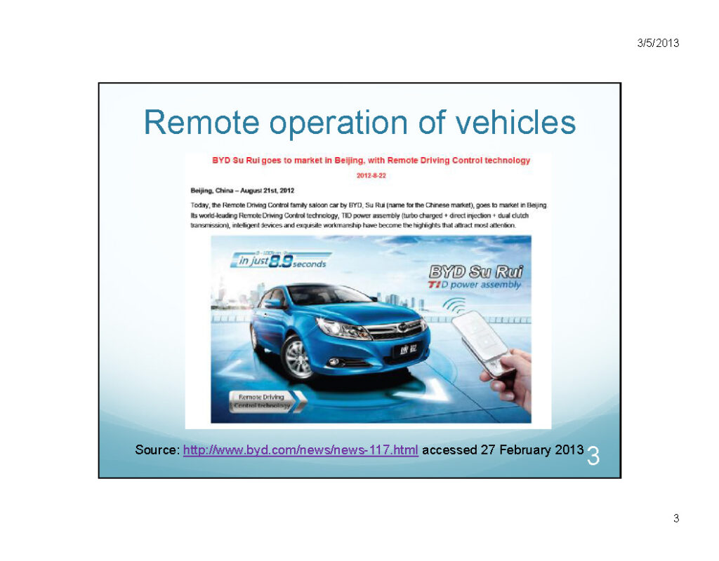 Recently, new vehicles and manufacturers have introduced advances in control technologies and marketing specifically to people with mobility challenges. In August 2012, the Chinese firm BYD put the Su Rui model on the market in Beijing, the first commercially available passenger vehicle with Remote Driving Control technology. The media were quick to realize that it is only a matter of time before the remote controls are hacked to remove the speed and range limiters (the remote control is intended to cap the speed at 2 kilometers per hour and the range at 20 meters in order to limit use of the technology to parking where there is not room to open the driver’s door). http://www.byd.com/news/news-117.html