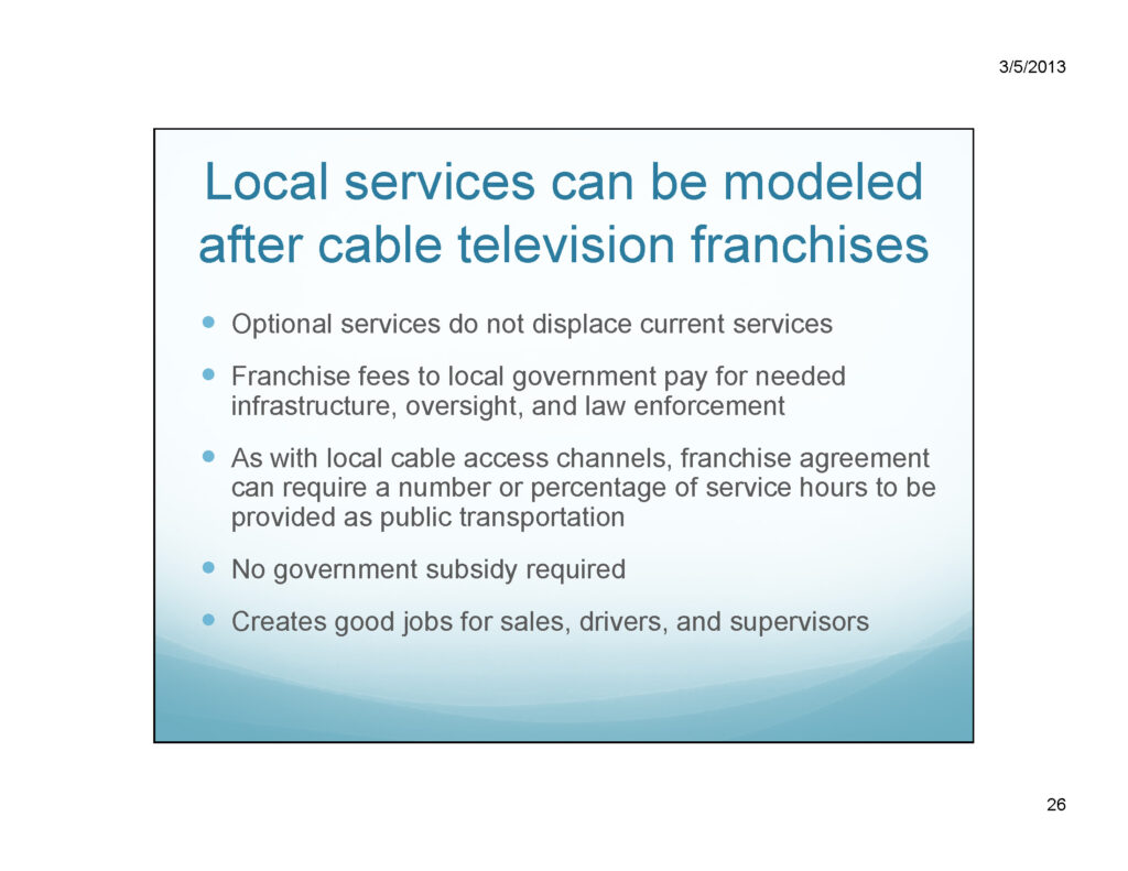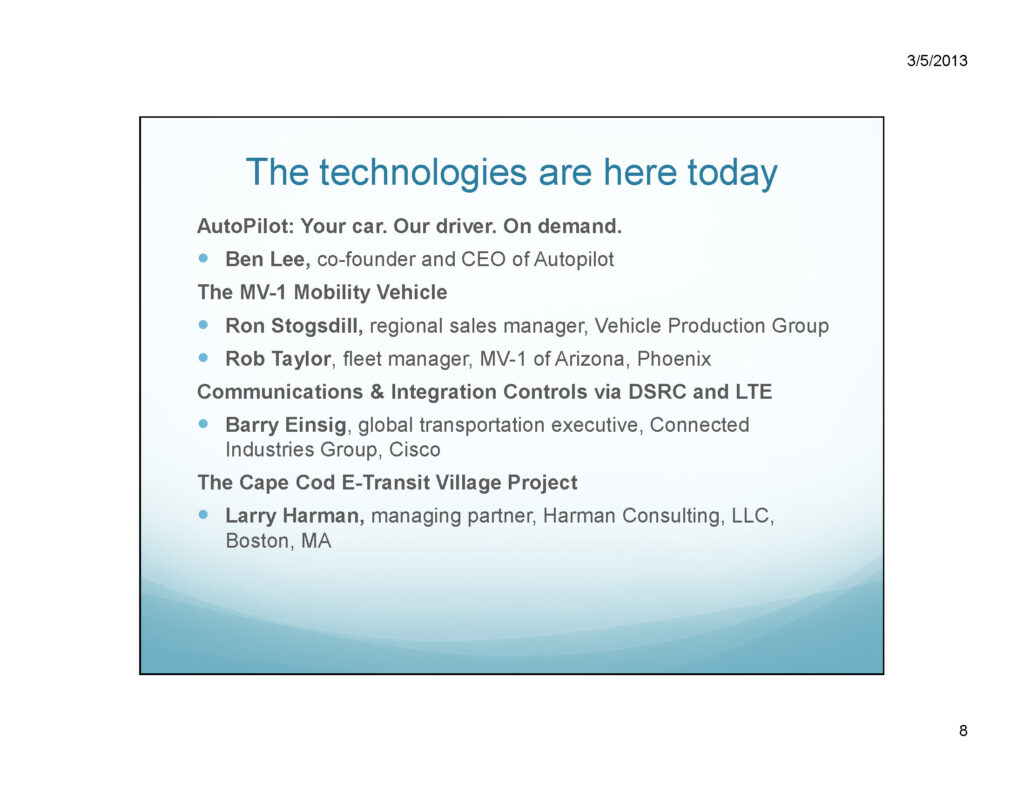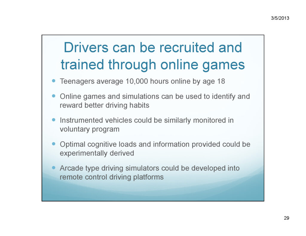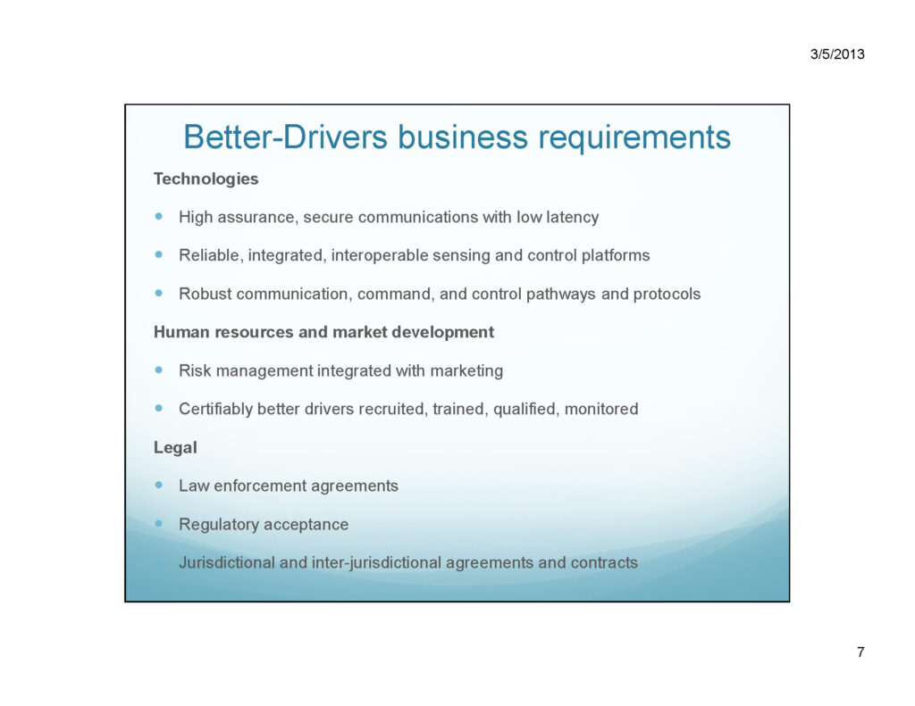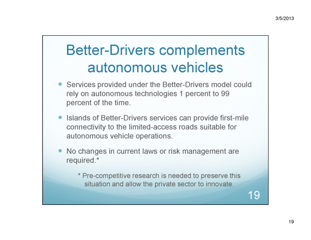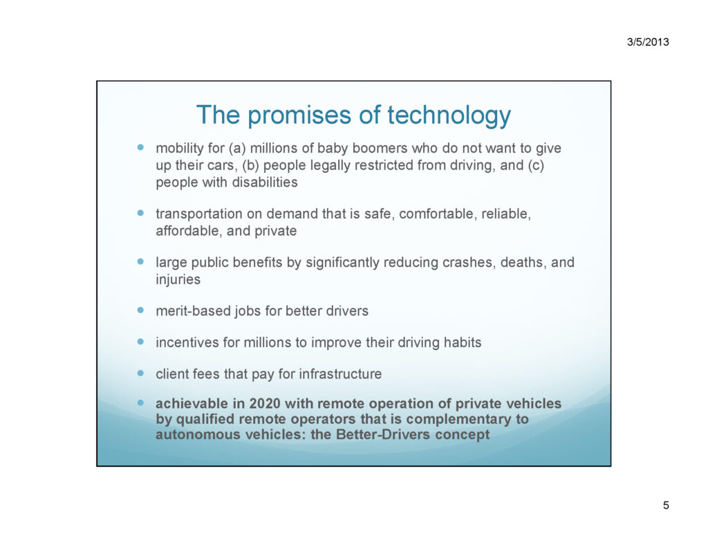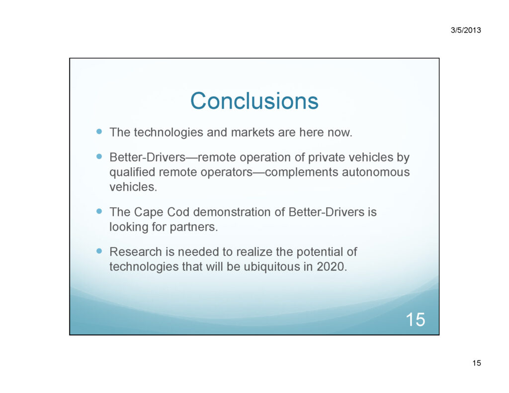 The business case for Better-Drivers–remote piloting of vehicles by qualified operators–was presented at these conferences: (1) 2013 National Rural Intelligent Transportation Systems Conference, St. Cloud, Minnesota; (2) 2013 American Public Transportation Association’s TransITech Conference, Phoenix, Arizona; (3) 2012 Intelligent Transportation Systems World Congress, Vienna, Austria.