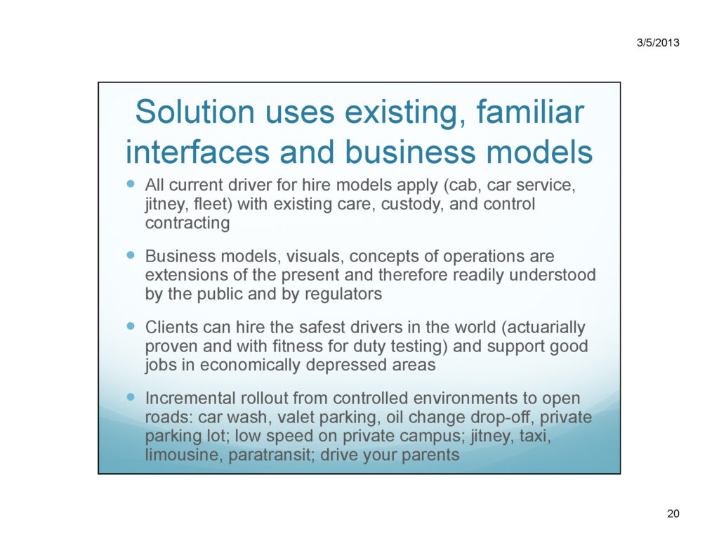 All current driver-for-hire models apply (taxicab, car service, limousine, jitney, paratransit) with existing care, custody, and control contracting. Business models, visuals, and concepts of operations are readily understood by the public and by regulators. BetterDrivers focuses on the low speed environment, providing mobility near the home. It can be incrementally rolled out from controlled environments to open roads. Eventually, you could use BetterDrivers to drive your parents.