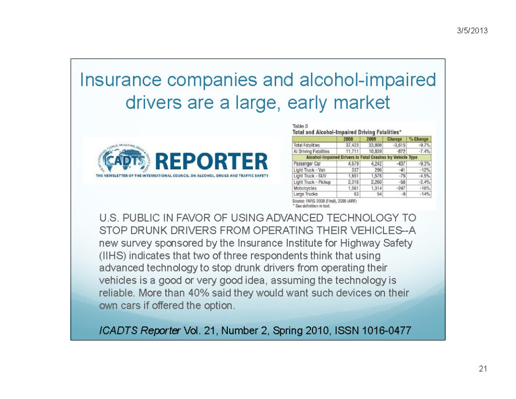 U.S. PUBLIC IN FAVOR OF USING ADVANCED TECHNOLOGY TO STOP DRUNK DRIVERS FROM OPERATING THEIR VEHICLES–A new survey sponsored by the Insurance Institute for Highway Safety (IIHS) indicates that two of three respondents think that using advanced technology to stop drunk drivers from operating their vehicles is a good or very good idea, assuming the technology is reliable. More than 40% said they would want such devices on their own cars if offered the option.