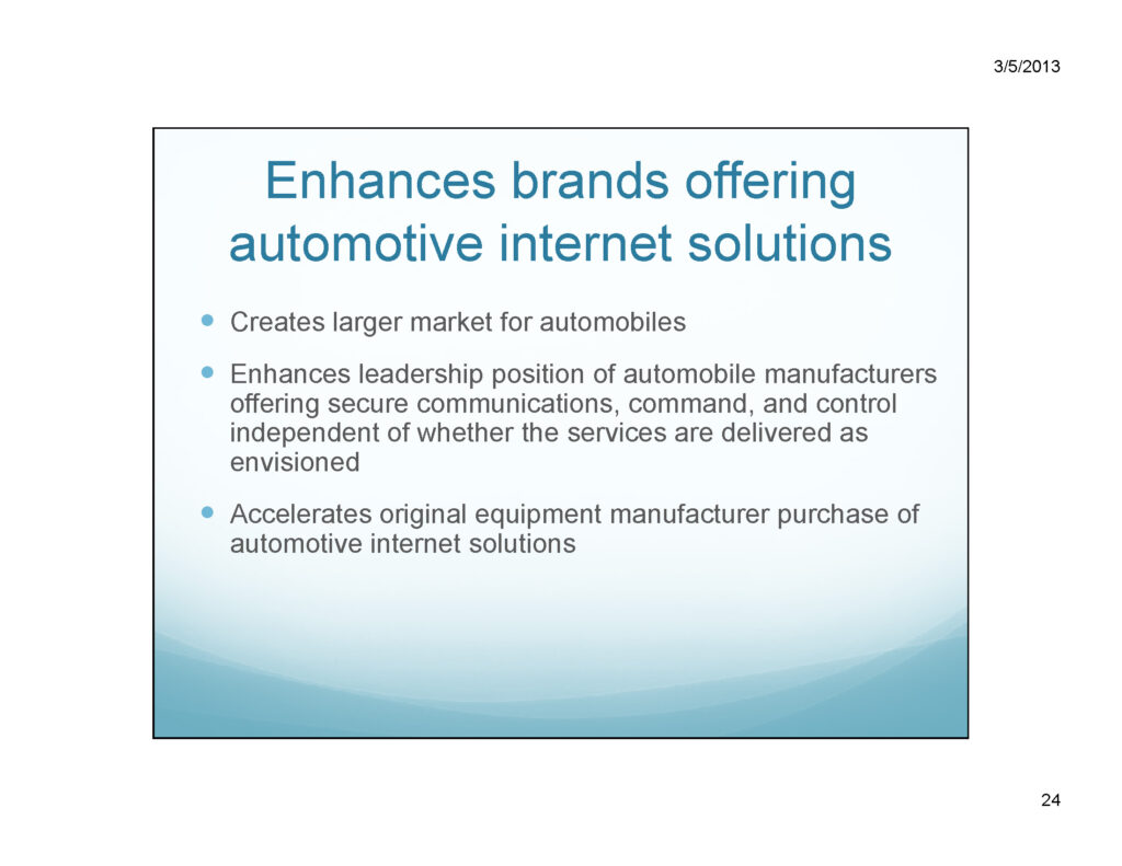 The opportunities for business can be tremendous. Car companies will enhance their images by offering secure communications, command, and control, whether or not the services are ordered. With BetterDrivers services in place, companies can sell cars to millions of people who do not drive. The safety and mobility implications are large, making government cooperation likely. Some car brands already exploit remote operations for marketing. The U.S. market is ready to pay for such technologies.