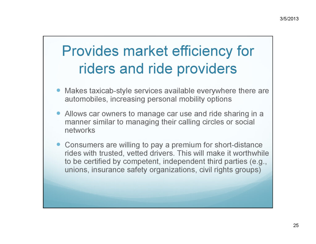 Car-sharing services have spread widely, but mobility for the entire mobile population requires more than just vehicles; drivers are needed, too. Examples of these innovations spreading from concepts to implementation can be found in the marketplace already. For example:
