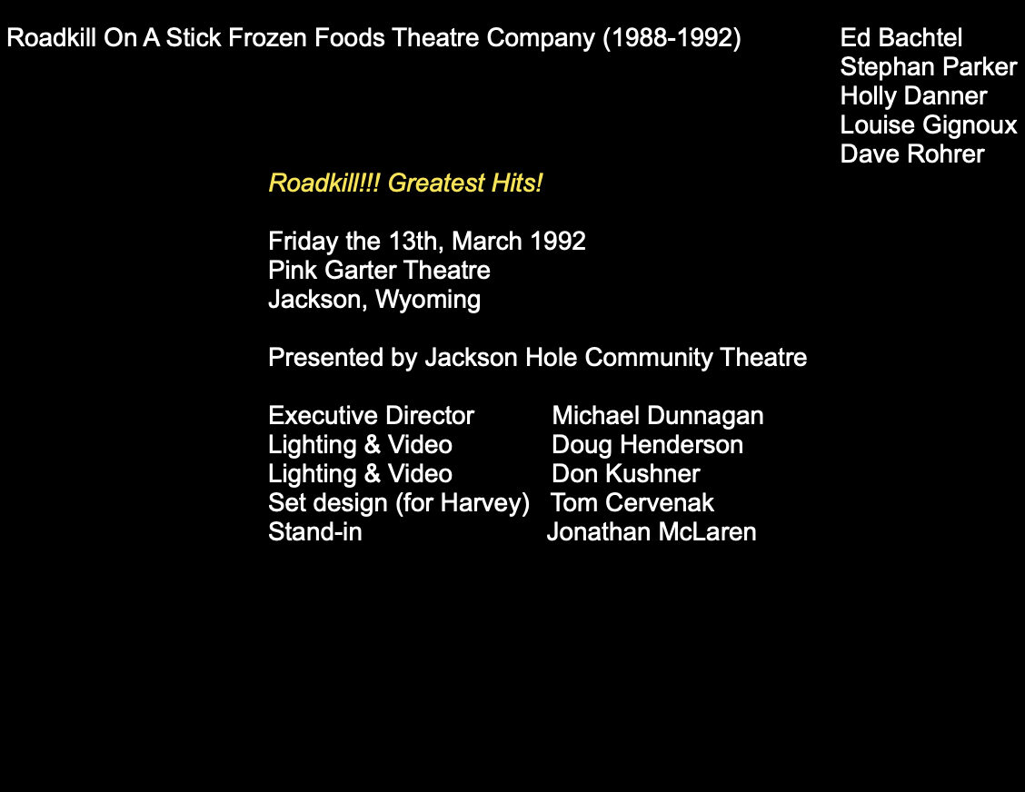By the time the troupe performed Roadkill!!! Greatest Hits! on Friday the 13th, 1992, we had learned an alternate way to spell “comedy revue.” We were still in thrall to 1980s color choices, though.
