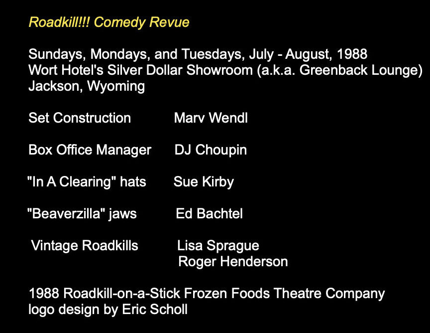 During the summer of 1988, the Roadkill!!! Live! Comedy Review ran for 8 weeks at the Silver Dollar Bar in the Wort Hotel in Jackson, Wyoming. That was the summer of the Yellowstone fires.